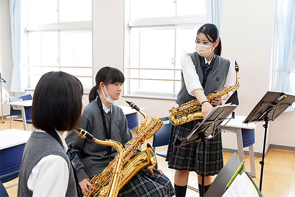 私は小学校からトランペットを演奏していたので、この吹奏楽部で演奏したいと思って藤村女子に入学しました。中学生の部員数はあまり多くありませんが、その分、先輩たちが優しくていねいに指導してくださり、楽しく活動できています。