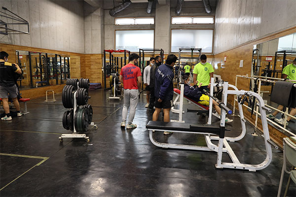 先生こちらは体育館棟の半地下にあるトレーニングルームです。日々身体を鍛える若者たちの熱気であふれている場所です。