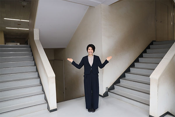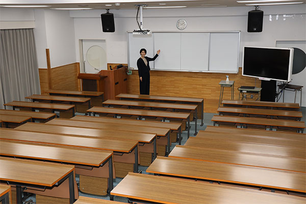 先生まずは第1体育館からです。3階建ての体育館棟のメイン施設で、バスケットコートなら2面取れる大きさがあります。冷暖房も完備しているので、講演会などの行事でも使用されています。