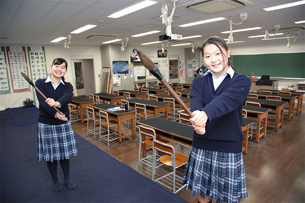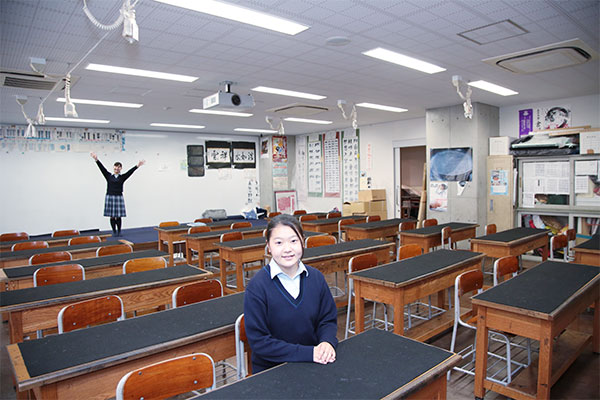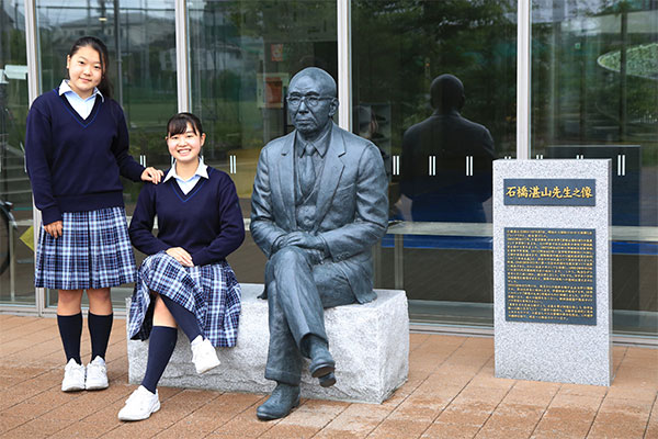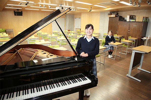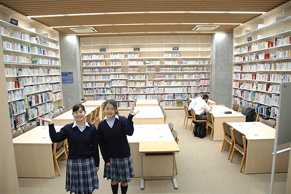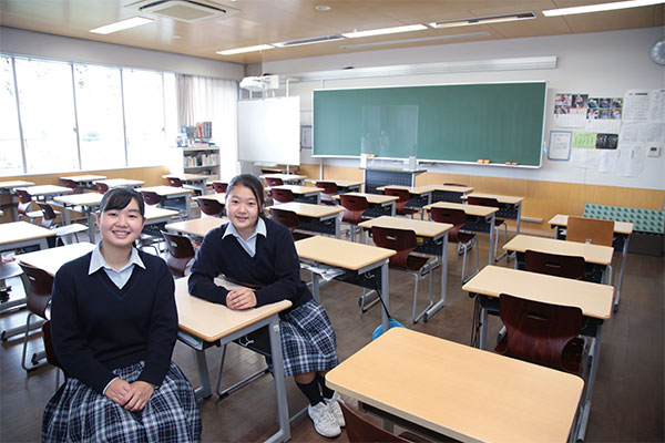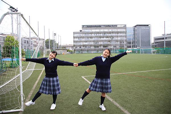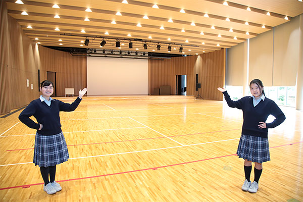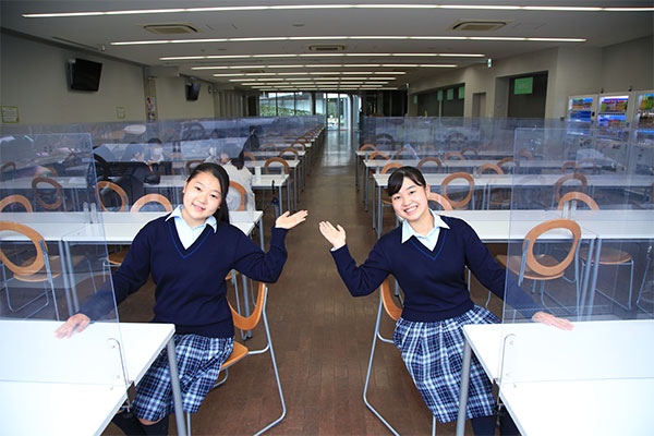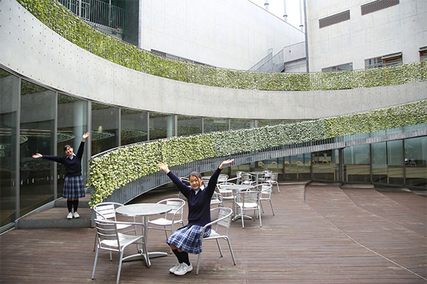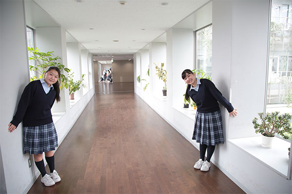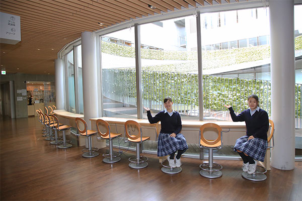 2013年に誕生した、同校の馬込キャンパス。ここには、心の教育を大切にしてきた100年を超える伝統が息づいています。快適さが行き届いたこの美しいキャンパスを、吉野朝香さん(高3)と古川未紗さん(高3)に案内してもらいました。