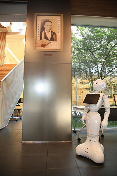 F.Nさんペッパーくんは、いつも創立者の肖像を見上げています。学校説明会に来た方に、説明会場のご案内もします。
