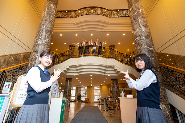 SさんAさんこちらはお客さまを迎える玄関です。カーブを描いた階段は『シンデレラ階段』と呼ばれています。生徒の入り口は別にあるけれど、急いでいるときにこの階段を使っている人も。生徒用の入り口には2台のサーマルカメラがあって、毎日体温を測ってから入ります。シンデレラ階段には、入学式のときに「入学おめでとう」の横断幕が飾られます。