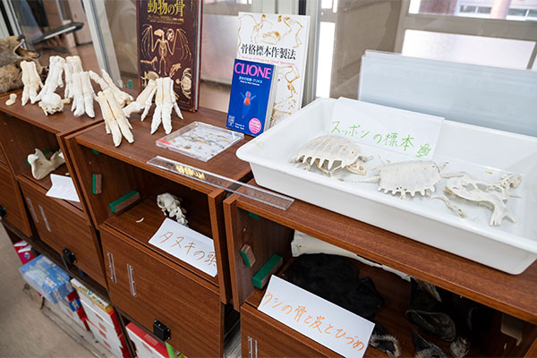 Nさん豚足や手羽先を使って動物の骨格を観察したりします。たぬきの標本もあります。これはすべて生物の先生が作ったものです。