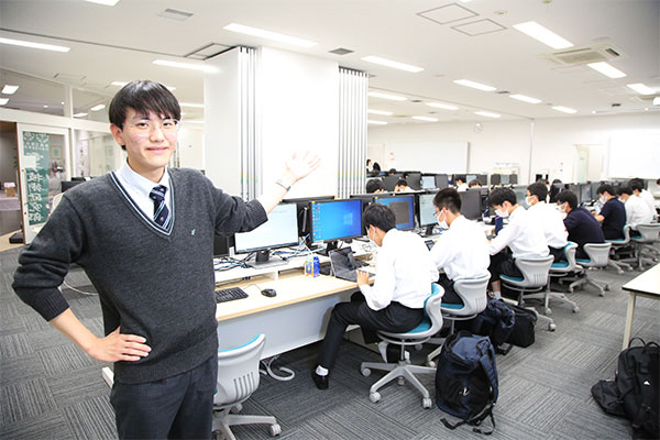 本田さんここは僕の好きなコンピューター室です! 100台くらいPCがあって、情報の授業などでも使っています。芝浦工業大学の教授や大学生、大学院生が来校して、その人たちのサポートで「ものづくり」を体験する『Arts and Tech』という授業もここで行っています。