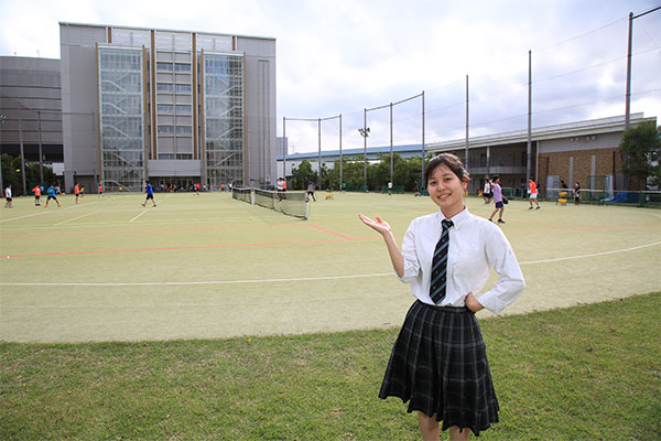 四十八願さんこちらは砂入り人工芝と一部天然芝のグラウンドです。部活動だと野球部、テニス部、サッカー部が使っています。フリスビーとかソフトボールとかいろいろな用具もそろっているので何でもできるんですよ。昼休みは男子がバレーボールとかドッジボールをして遊んでいます(笑)