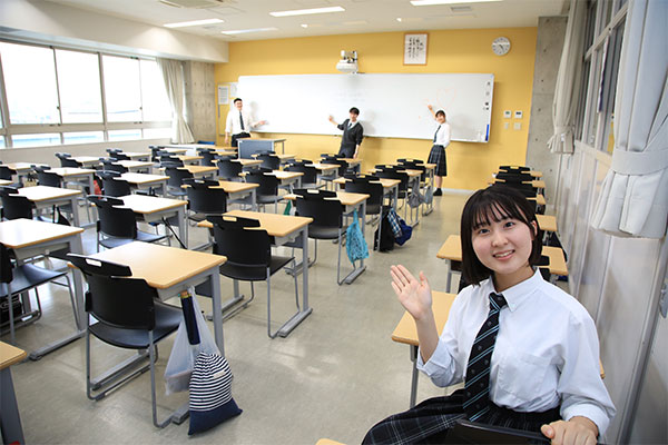 山口さんこちらは私たちが普段使っている普通教室です。全教室に電子黒板とプロジェクターがついていて、先生のPCや私たちのタブレット端末ともつなげられるんです。