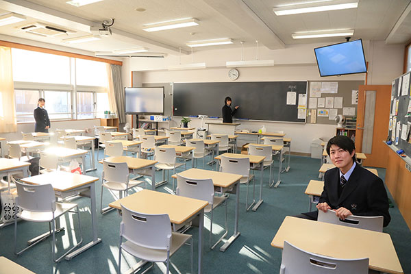 大野さんこちらは普通教室です。モニターが左右に備わっていて、授業で使う資料や動画がこのモニターに映し出されます。