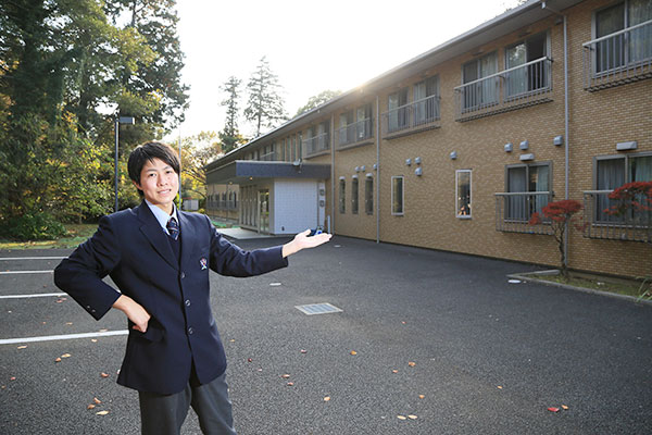 柳田さんこちらが女子寮です。私は寮生で、この女子寮で生活しています。麗澤はイギリスのパブリックスクールをモデルにしてつくられました。パブリックスクールは寄宿制なので、この学校も創立当初は全寮制でしたが、1992年に通学制が導入され、寮か通学かを選べるようになっています。