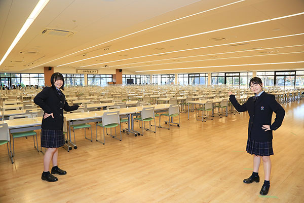 川瀨さんこちらが食堂の『けやき』です。2017年に完成しました。1,200席あり、ここで生徒がお昼に給食を食べます。