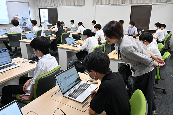 グループでの話し合いが行き詰まると、すかさず先生がフォローに回ります。また、受験生個々の意見がパソコンの画面上で共有できるため、写真奥のような「対面での会話重視派」のグループと、「対面せずともパソコン上でOK」というグループに分かれていました。