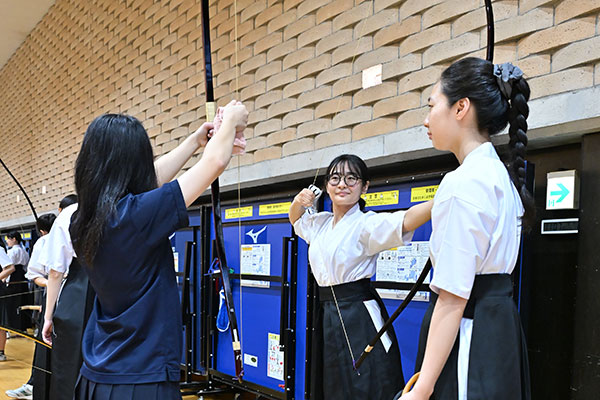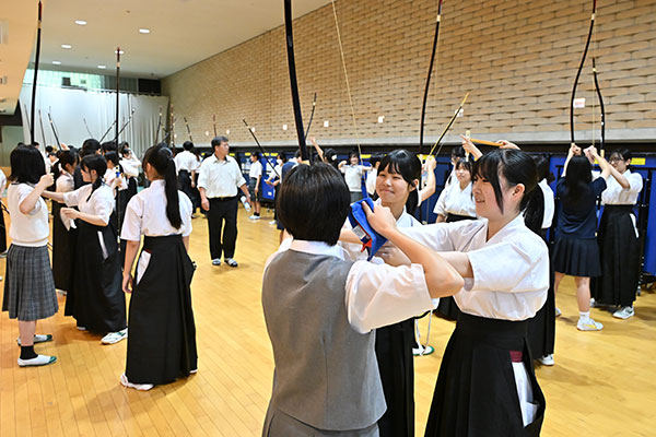 「弓を引く」という動作をやってみることはあまりないため、思いのほか難しいようです。「背筋を伸ばして」「重心を後ろに」とアドバイスが飛び交っていましたが、堅苦しい雰囲気はなく、部員も受験生も笑顔にあふれていました。
