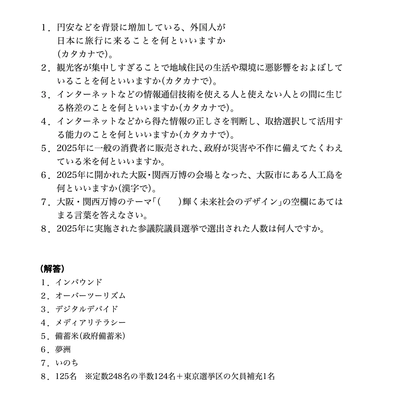 11月~12月頃には、塾の授業でも時事問題を扱うようになります。塾で配付される教材で学習を進めましょう。もちろん、志望校の入試でどの程度時事問題が出されているかを見極めることも必要です。言葉だけを問うような出題であれば、教材をおさらいするだけでもいいでしょう。ですが、背景まで深く踏み込み、記述させるような問題が出る場合は、問題演習に取り組み、わからないことは塾のテキストに戻って関連部分まで確認するようにしましょう。
