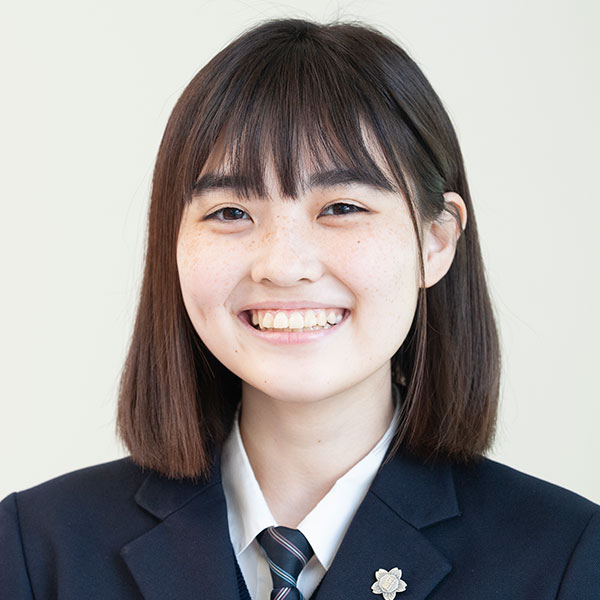 もともと人見知りで、人前で発言することが苦手でしたが、「私の研究」のフィールドワークで初対面の人に会うことも経験して、人前で話すことに抵抗がなくなりました。「私の研究」では、中学高校と音楽に関するテーマを選び、音楽により深く興味をもつようになり、自分で取り組む力がつきました。卒業式では、普段の年は在校生が卒業生の前で歌を歌うのですが、今年の卒業式はコロナの影響で独唱になりました。そのときに指名されて歌ったことで、人前で歌いたいという気持ちが強くなりました。この学校には学園歌がたくさんあり、毎日のように歌います。それもこの学校の魅力のひとつです。