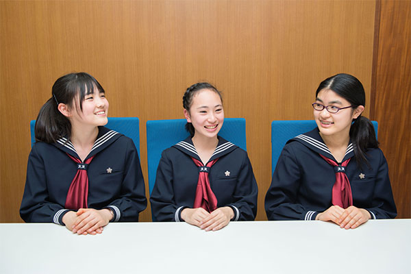 幅広い進路に対応する「本科コース」、実践的な語学力を育てる「グローバル留学コース」、理数系進路に特化した「スーパーサイエンスコース」と、特色ある3コースで多様な進路希望の実現を目指す同校。弊誌2017年6月号でお話を聞いた当時中1だった3名の生徒は高3となりました。同校で過ごした彼女たちは6年間をどのように過ごしてきたのでしょうか。その成長ぶりを聞いてみました。