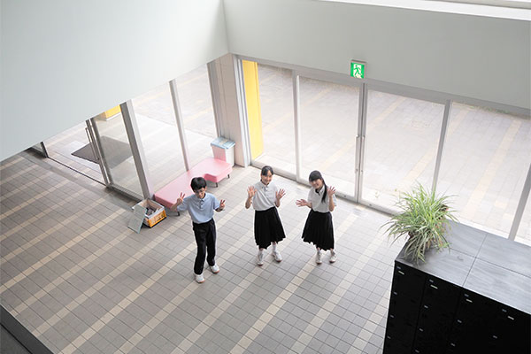 若林さん次にご紹介するのは、小講堂です。窓際に立っているのは、演劇部の部員です。窓の外に向かって、大きな声で発声練習をしています。