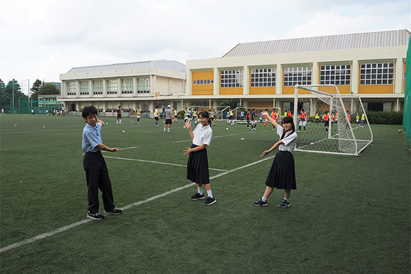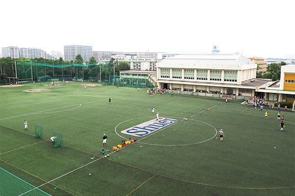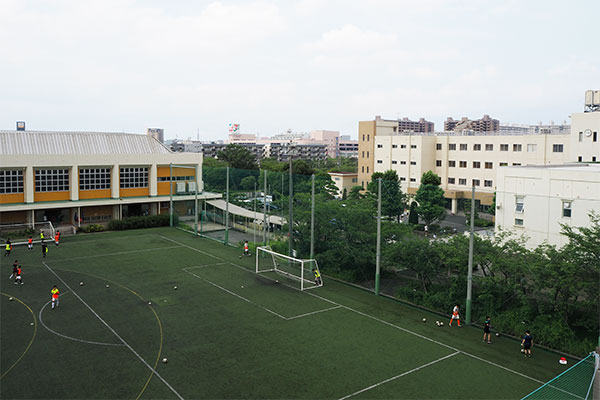 宮﨑さんこちらがグラウンドです。全面人工芝になっていて、サッカー部が練習しています。
