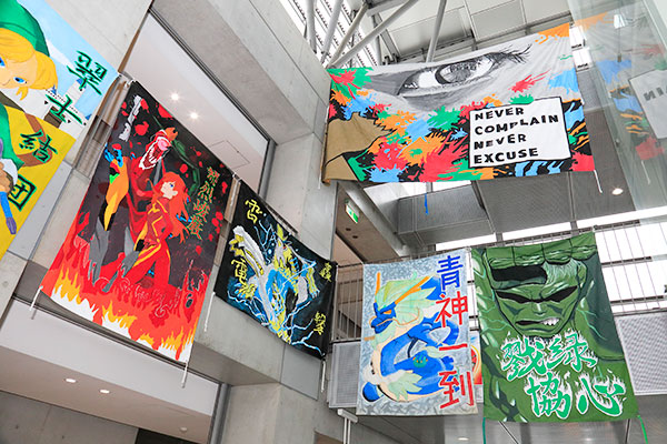 体育祭が近づくと、校舎内に各団のシンボルとなる旗が掲示されます。