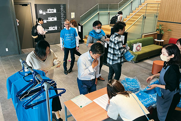 「教職員への感謝の日」に、エントランスホールで出勤してきた先生方にTシャツを贈ります。
