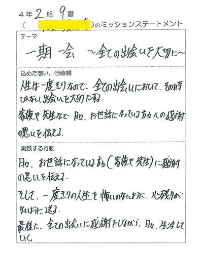 4年生の『ミッションステートメント』。この生徒は人生のテーマを「一期一会~全ての出会いを大切に~」と記しています。