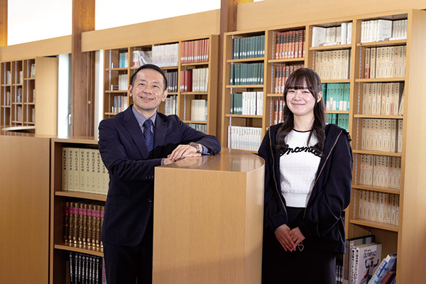 木の香りが心地良い図書館にて、近藤先生(左)とIさん。