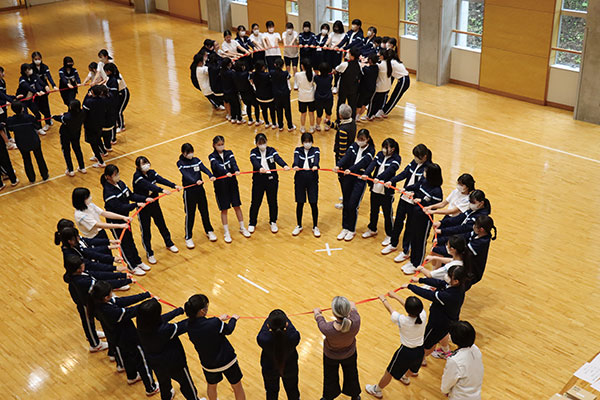 中1生が入学直後に参加する「プロジェクトアドベンチャー」。自分を何と呼んでほしいか伝えてボールを渡すネームトスなど、身体を動かしながらコミュニケーションを図り、主体性、協働性、課題解決能力といった生徒の可能性を引き出すプログラムです。