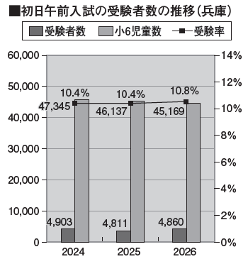 初日午前受験者数は4860人(前年度4811人)で、受験率は10.8%(同10.4%)。特に受験率はここ5年ほどほぼ横ばいでしたが大きく上昇した形で、高校授業料無償の影響が、兵庫にも広がってきたことがうかがえます。