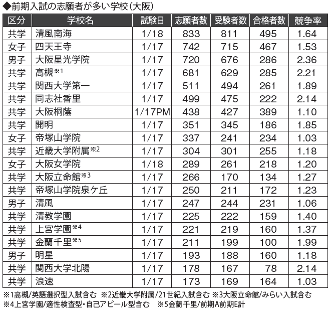 大きく目立ったのは開明です。受験者数は345人(同272人)、ほか3回の入試もすべて増加して競争率も2倍超え。関西大倉も121人(同101人)をはじめ全日程で増加、金蘭千里も1 9 9 人( 同184人)と増加。