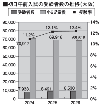 初日午前受験者数は8530人(前年度8491人)、受験率も過去最高の12.4%(同12・1%)。高校授業料無償化の影響で大きく増加した前年度の反動もなく、さらに上昇した形です。地盤そのものが底上げされたと見てよいでしょう。