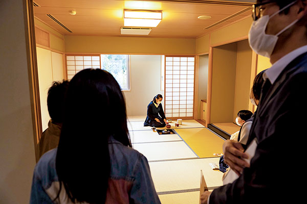 日本の様式美が感じられる和室では、茶道部が活動中。厳かな雰囲気と美しい所作に感化されたのか、さっきまでにぎやかだった児童たちも静かな態度で見守っていた。