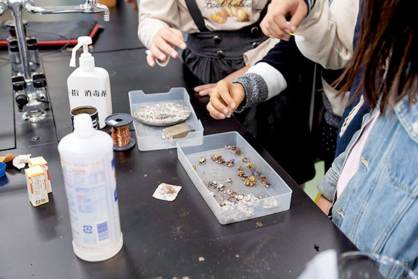 銅や錫(すず)などの金属が、電気分解でどのように変化するかという実験を見学。「ビスマスという金属を溶かして冷やして固まると、結晶化して角張ったユニークな形状になります」という生徒からの解説を、皆、興味津々に聴いていた。