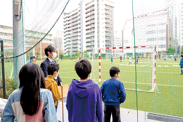 サッカー部の練習を見学。人工芝のグラウンドは水はけが良く、夜間はLED照明で明るく照らされるなど、安全面に配慮されている。部活動は、中学生は18時まで、高校生は19時まで活動が可能。