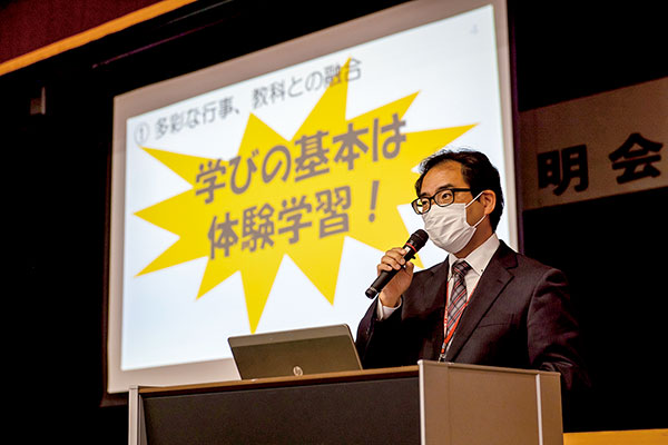 教育活動全般について話された竹森順一中学教頭。児童や保護者の目線に立ったわかりやすい解説が行われた。