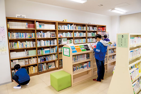 約4万6000冊の蔵書を誇る図書館。磁気式の図書カードを利用することにより、貸し出しと返却がスムーズに行える。しばらく自由見学の時間も設けられ、児童たちは思い思いの本を手に取り楽しんだ。
