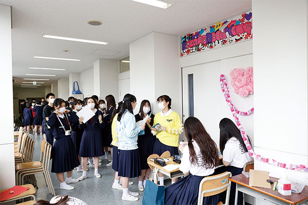 今年は模擬店が復活し、高3はクラスごとに個性あふれる出し物を開催していました。学年企画では中学生も大活躍。教室内の飾りつけや、ダンボールや新聞紙でゲームを作るなど、クラス皆で午後からの出し物の準備をしていました。「準備を通していろいろな人と話して仲良くなれました」という中1生。学園祭は、入学・進学したばかりでまだ慣れないクラスメートたちとコミュニケーションを図り、友人関係を築く場としての位置づけもあるそうです。