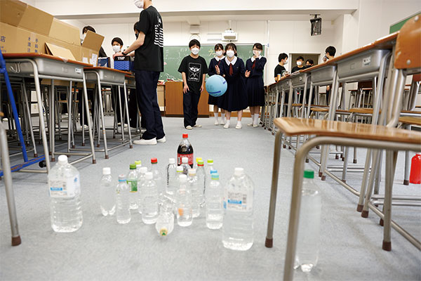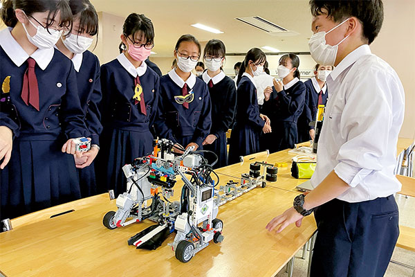 理科部ロボット班による実演には多くの生徒が注目。真剣な表情で部員の話に耳を傾ける。同部は世界大会に参加した実績もあり、ロボット作りやプログラミングなど、ハイレベルな活動内容で日々取り組んでいる。