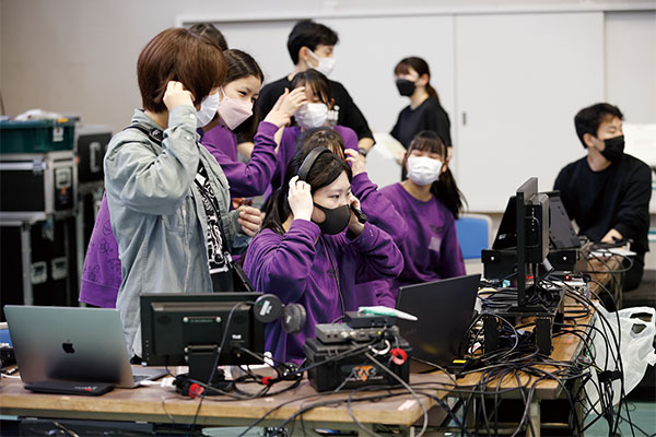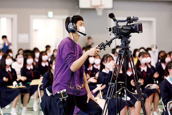 紫色のトレーナーを着用した“ステージパート"の生徒たちは、音声やカメラ、照明など、ステージ上の演出すべてを担当。