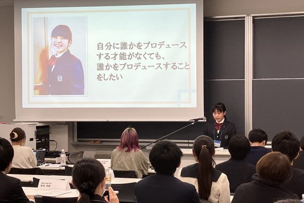 著名人の人生について調べてまとめ、プレゼンテーションをする取り組み。自分が興味を持った人物を一人選び、同じ人物を選んだ生徒同士でチームを組み、先人の生き方や人生について探究を進めます。小道具を使ったり、寸劇で表現するなど、チームごとに独創性たっぷりのアプローチで発表が行われます。ポイントは、著名人をロールモデルとして、自分の生き方を考えるきっかけにすること。