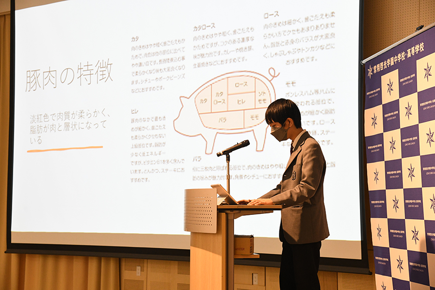 中学校生活における探究学習の集大成。自由にテーマを設定して一年間をかけて探究を重ね、結果をまとめて発表します。研究成果は「分析力」「情報整理力」「研究力」「発信力(スライド)」「発信力(プレゼン)」の5項目で、先生方が審査にあたります。