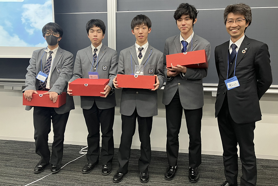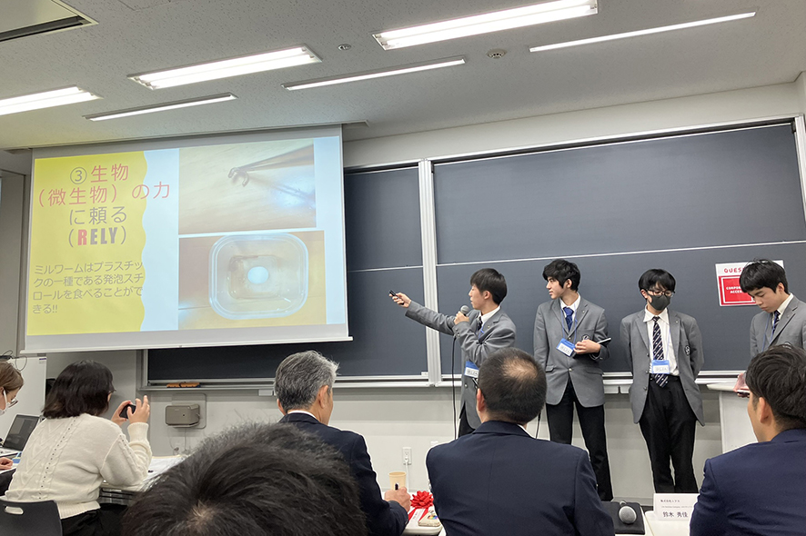 「企業が抱える問題」を題材に、チームで解決策を考えます。高1で経験するENAGEEDが問題の発見・解決能力を養うものだとすると、こちらはより社会的な実践性が高いところがポイントです。協力企業は多岐にわたります。「『隠れた重さ』から世界を解放する新サービスを提案せよ」「人々の『育んできた大切』をつむいで私たちが望むくらしの新常識を提案せよ」など、投げられるお題もさまざま。複数回ある中間発表では各社の担当者からアドバイスをもらいつつ、試行錯誤しながら内容をブラッシュアップさせていきます。回数を重ねるごとに生徒たちがのめり込んでいくのが目に見えてわかるそうで、大人たちも舌を巻く提案が続出。