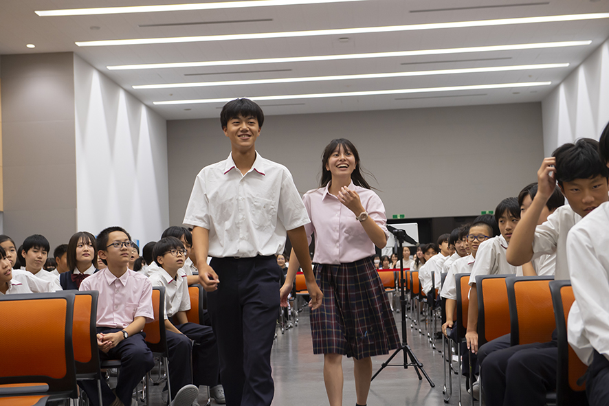 最優秀賞」を受賞し、輝かしい表情で表彰式に向かう3年3組の生徒たち。乾校長先生は、「今日のコンクールが待ち遠しかった人は、準備ができている人。何事も準備が大切で、それは演劇も勉強も同じです。皆さん、素晴らしい作品をありがとうございます」と、労いの言葉を贈った。