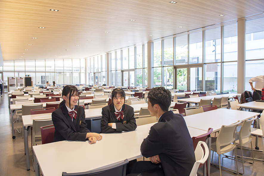 350名超が収容できる食堂『いくんどキッチン』は、ガラス張りで明るく、オープンな雰囲気。学園創立者・島村育人の名前を冠し生徒の発案で命名されたという。テーブル席・カウンター席・ソファー席が設置され、食堂としての利用だけでなく、自習室・コミュニケーションスペース・行事・クラブ活動など、さまざまな用途で生徒に親しまれる空間になっている。ウォーターサーバー設置のほか、コンビニエンスストアやアイスクリームの自動販売機で軽食を購入することもできる。